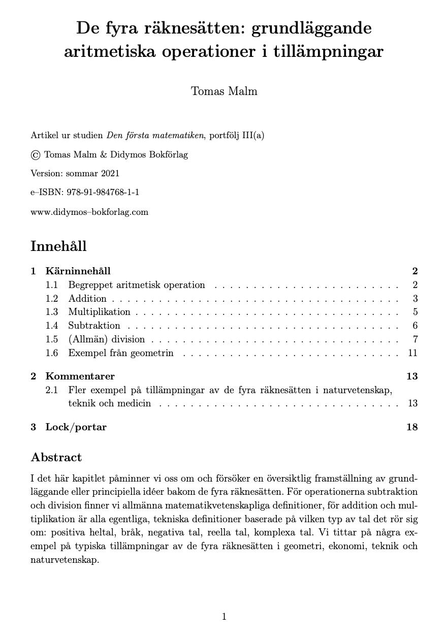I det här dokumentet påminner vi oss om och försöker en översiktlig framställning av grundläggande eller principiella idéer bakom de fyra räknesätten. För operationerna subtraktion och division finner vi allmänna matematikvetenskapliga definitioner, för addition och multiplikation är alla egentliga, tekniska definitioner baserade på vilken typ av tal det rör sig om: positiva heltal, bråk, negativa tal, reella tal, komplexa tal. Vi tittar på några exempel på typiska tillämpningar av de fyra räknesätten i geometri, ekonomi, teknik och naturvetenskap.