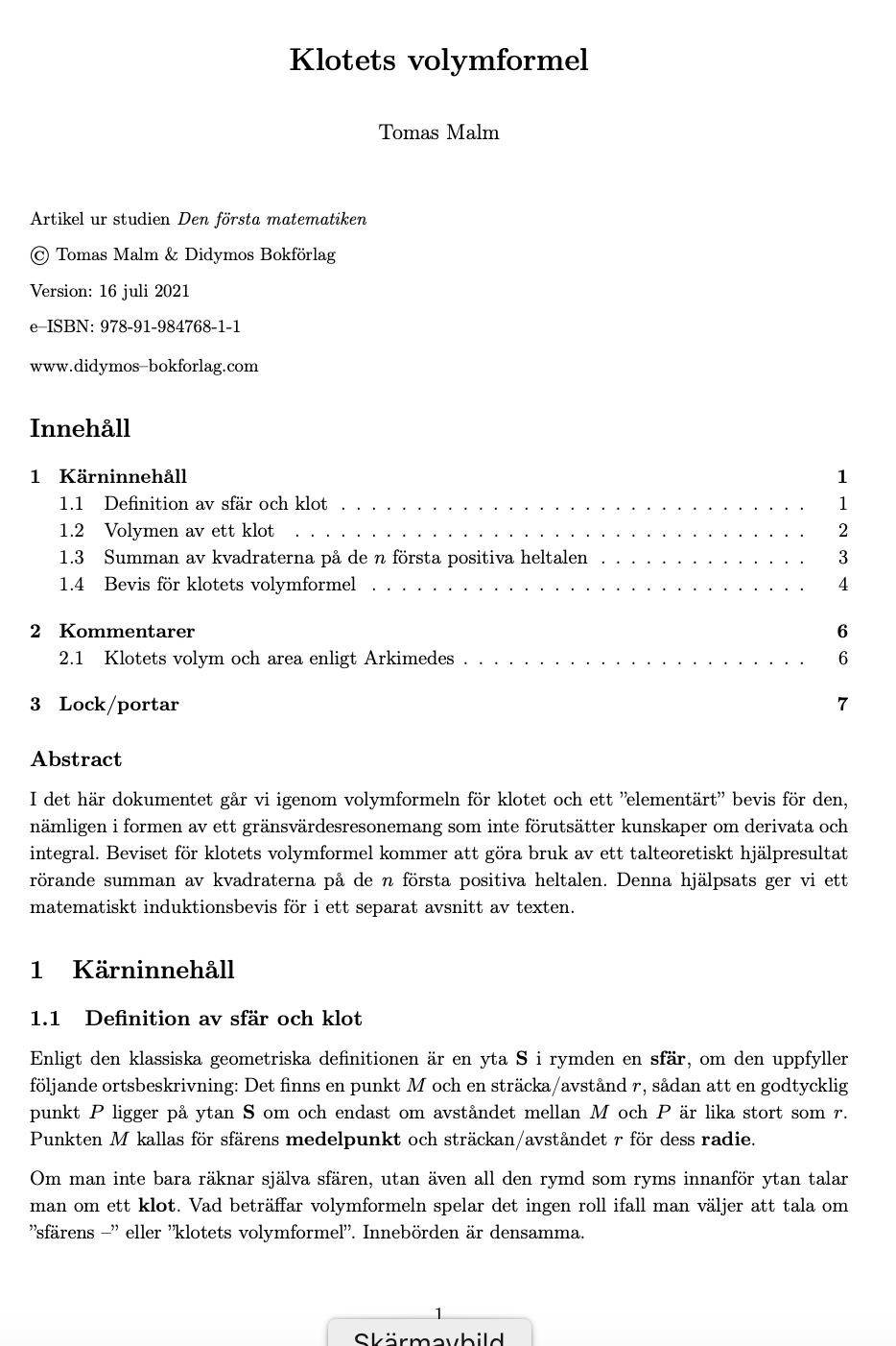 I det här dokumentet går vi igenom volymformeln för klotet och ett ''elementärt'' bevis för den, nämligen i formen av ett gränsvärdesresonemang som inte förutsätter kunskaper om derivata och integral. Beviset för klotets volymformel kommer att göra bruk av ett talteoretiskt hjälpresultat rörande summan av kvadraterna på de n första positiva heltalen. Denna hjälpsats ger vi ett matematiskt induktionsbevis för i ett separat avsnitt av texten.