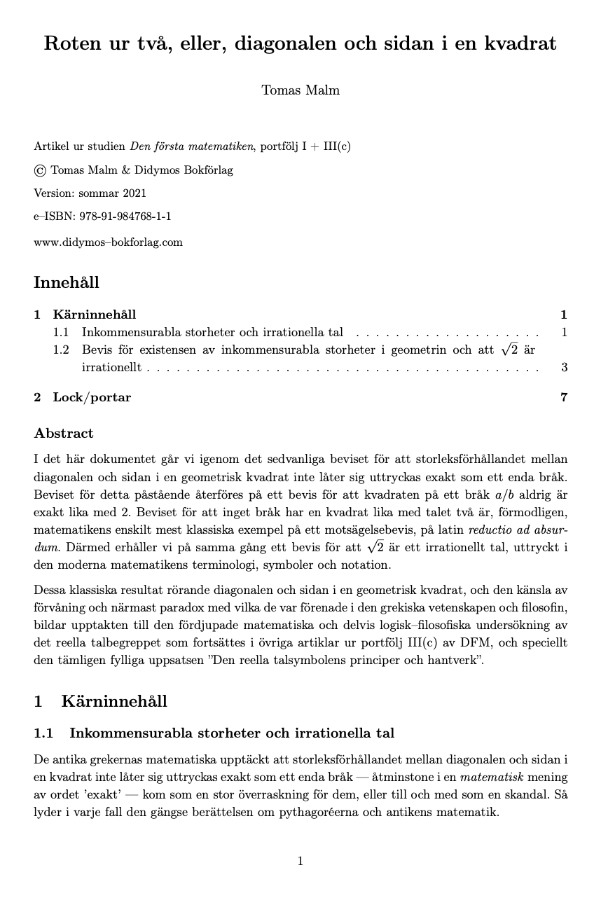I det här dokumentet går vi igenom det sedvanliga beviset för att storleksförhållandet mellan diagonalen och sidan i en geometrisk kvadrat inte låter sig uttryckas exakt som ett enda bråk. Beviset för detta påstående återföres på ett bevis för att kvadraten på ett bråk a/b aldrig är exakt lika med 2. Beviset för att inget bråk har en kvadrat lika med talet två är, förmodligen, matematikens enskilt mest klassiska exempel på ett motsägelsebevis, på latin reductio ad absurdum. Därmed erhåller vi på samma gång ett bevis för att "kvadratroten ur 2" är ett irrationellt tal, uttryckt med den moderna matematikens terminologi och symbolspråk.