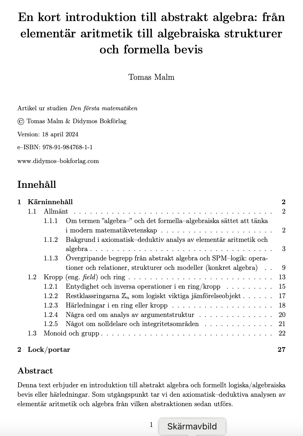 Denna text erbjuder en introduktion till abstrakt algebra och formellt logiska/algebraiska bevis eller härledningar. Som utgångspunkt tar vi den axiomatisk-deduktiva analysen av elementär aritmetik och algebra från vilken abstraktionen sedan utförs.
