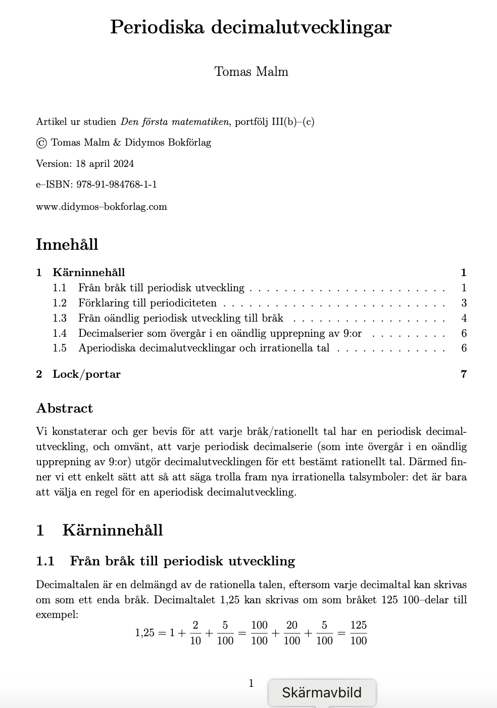 Vi konstaterar och ger bevis för att varje bråk/rationellt tal har en periodisk decimalutveckling, och omvänt, att varje periodisk decimalserie (som inte övergår i en oändlig upprepning av 9:or) utgör decimalutvecklingen för ett bestämt rationellt tal. Därmed finner vi ett enkelt sätt att så att säga trolla fram nya irrationella talsymboler: det är bara att välja en regel för en aperiodisk decimalutveckling.