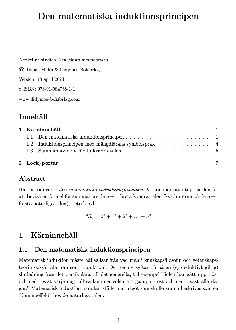 Här introduceras den matematiska induktionsprincipen. Vi kommer bland annat att utnyttja den för att bevisa en formel för summan av de n+1 första kvadrattalen (kvadraterna på de n+1 första naturliga talen).